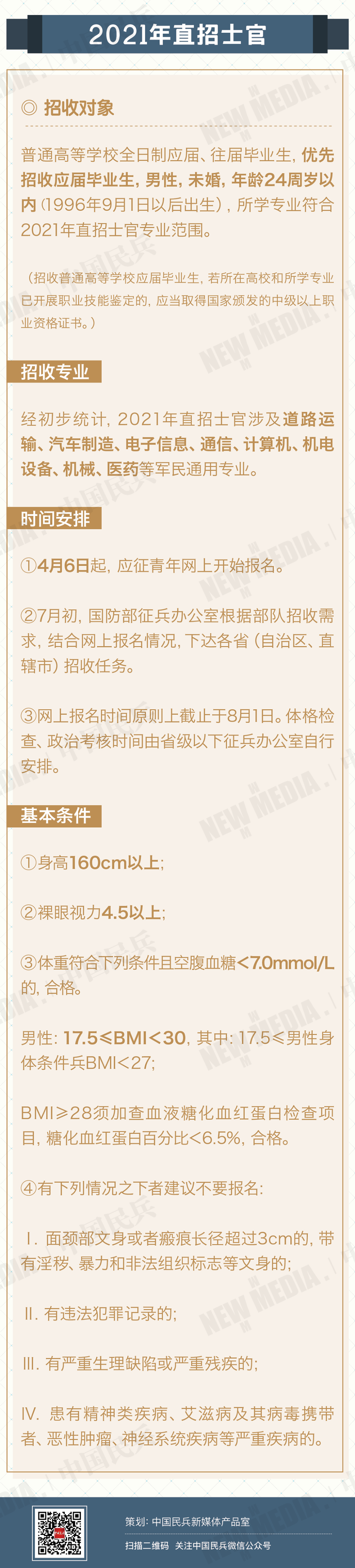直招士官和下半年義務(wù)兵征集可同時(shí)報(bào)名,因應(yīng)征地招收士官專業(yè)和計(jì)劃限制,未能被確定為直招士官送檢對象的,可以繼續(xù)參加義務(wù)兵征集。
