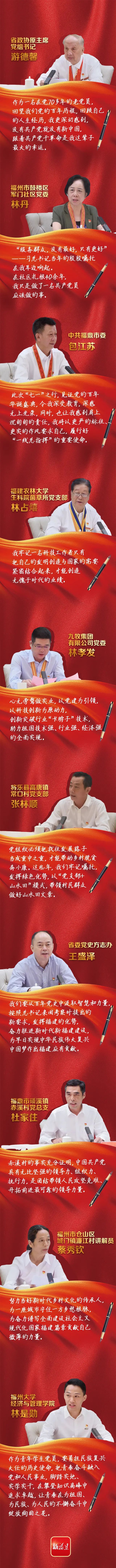 7月2日,福建省慶祝中國共產(chǎn)黨成立100周年座談會在福州召開。“七一勛章”獲得者林丹、全國優(yōu)秀縣委書記包江蘇、全國優(yōu)秀共產(chǎn)黨員林占熺、全國優(yōu)秀黨務(wù)工作者林孝發(fā)、全國先進(jìn)基層黨組織書記張林順,省級老同志游德馨,黨史社科領(lǐng)域?qū)<彝跏?、省脫貧攻堅先進(jìn)集體代表杜家住、基層黨員代表蔡秀欽、青年黨員學(xué)生代表林是勛先后在會議上作了交流發(fā)言,暢談學(xué)習(xí)習(xí)近平總書記重要講話的體會和感受。