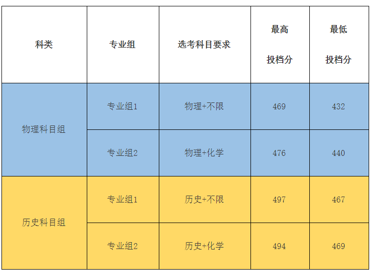 歷史組(不設(shè)選考科目)投檔最高分512,最低分477物理組(不設(shè)選考科目)投檔最高分 504,最低分 447