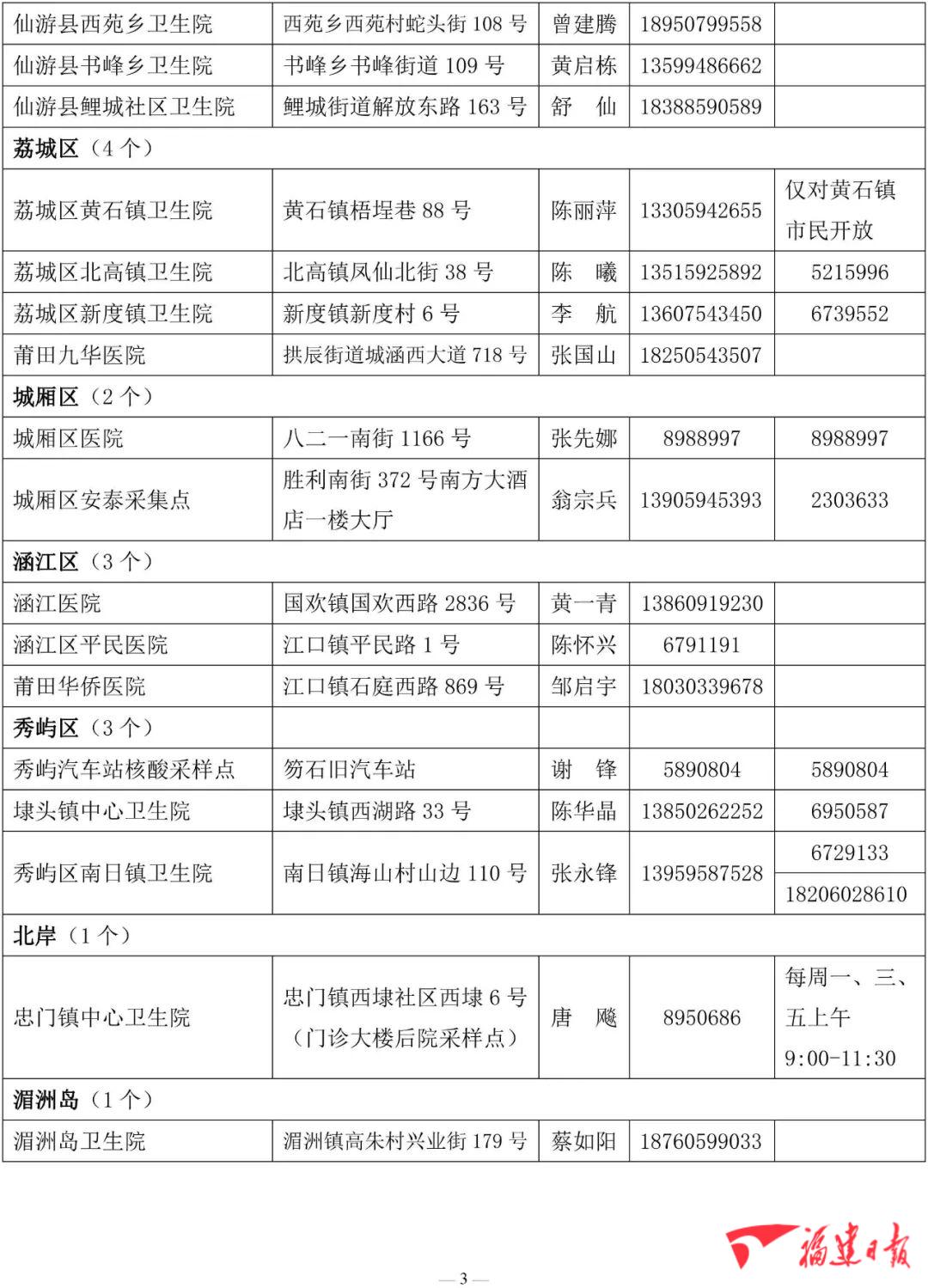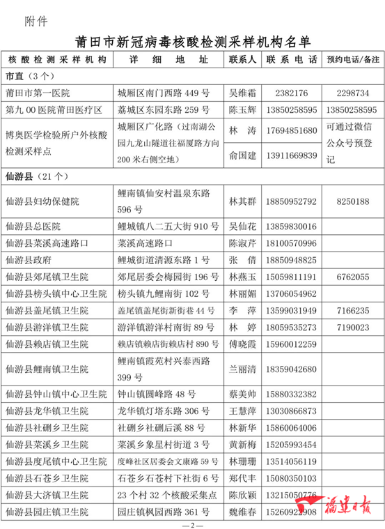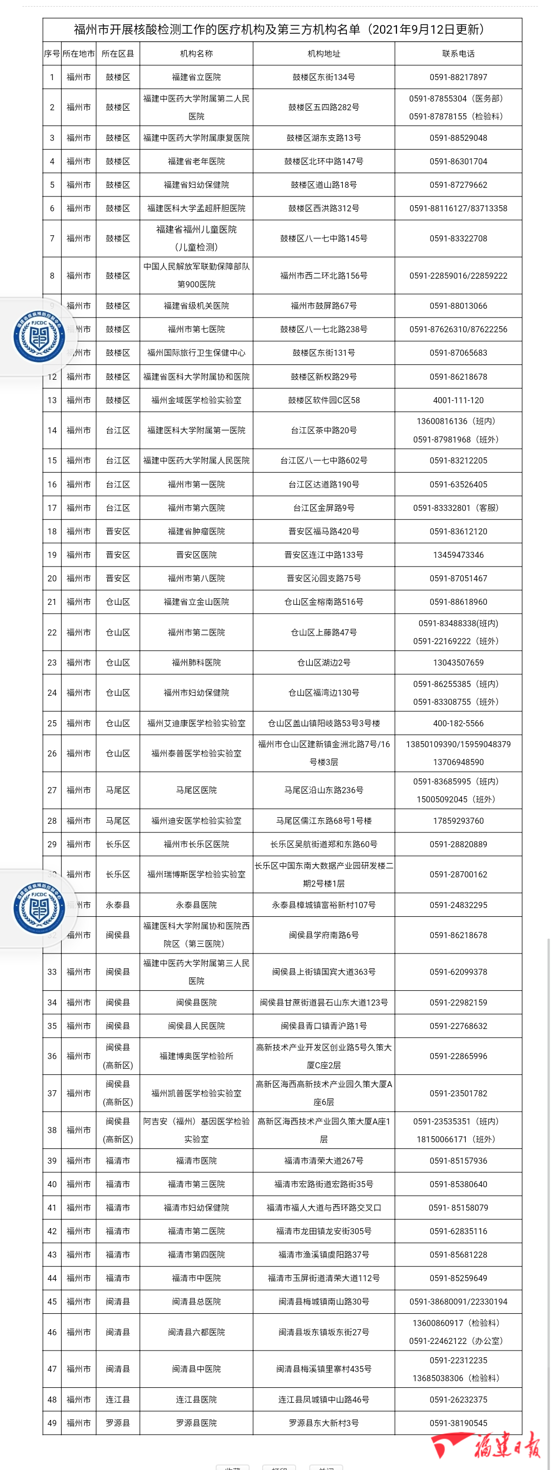 據(jù)悉,12日莆田市應(yīng)對(duì)新型冠狀病毒感染肺炎疫情工作指揮部綜合協(xié)調(diào)組根據(jù)當(dāng)前局勢(shì)和實(shí)際情況,經(jīng)各縣區(qū)(管委會(huì))指揮部核實(shí)確認(rèn),現(xiàn)將全市對(duì)外開放的新冠病毒核酸檢測(cè)采樣機(jī)構(gòu)名單匯總公布如下: