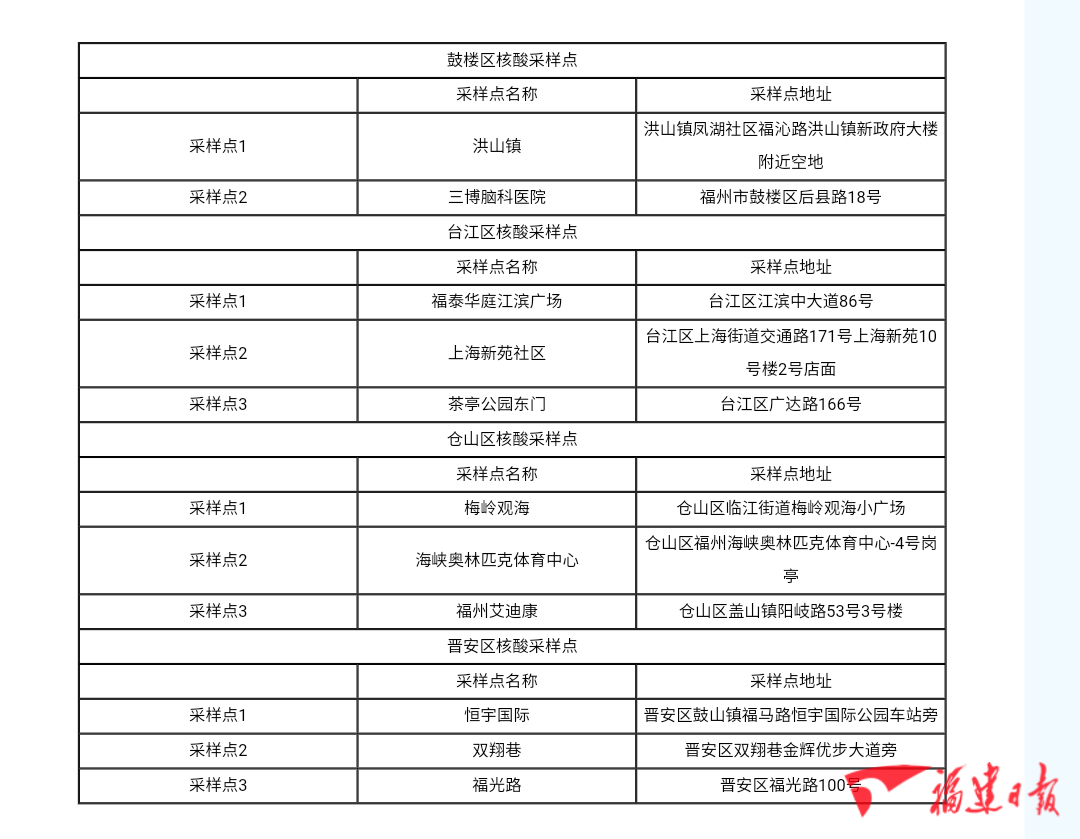 為滿足群眾近期核酸檢測(cè)需求,13日,福州市新型冠狀病毒感染肺炎疫情防控工作應(yīng)急指揮部在鼓樓區(qū)、臺(tái)江區(qū)、倉(cāng)山區(qū)、晉安區(qū)分別設(shè)置2-3個(gè)核酸采樣點(diǎn),請(qǐng)需要核酸檢測(cè)的群眾到就近采樣點(diǎn)有序采樣。同時(shí),按照疫情防控工作要求,聽從現(xiàn)場(chǎng)工作人員安排和引導(dǎo),并佩戴好口罩,保持“一米線”距離,不聚集。采樣時(shí)間:8:00-20:00。