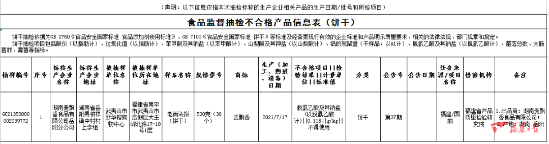 湖南麥飄香食品有限公司岳陽分公司2021年7月17日生產(chǎn)的老面法餅(餅干),脫氫乙酸及其鈉鹽(以脫氫乙酸計)不合格,銷售單位為武夷山市新華榕購物中心,檢驗機(jī)構(gòu)為福建省產(chǎn)品質(zhì)量檢驗研究院。