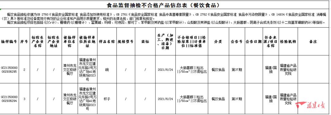 漳州市龍文區(qū)極研餐廳的碗(消毒日期為2021年6月24日),大腸菌群不合格,檢驗機(jī)構(gòu)為福建省產(chǎn)品質(zhì)量檢驗研究院;