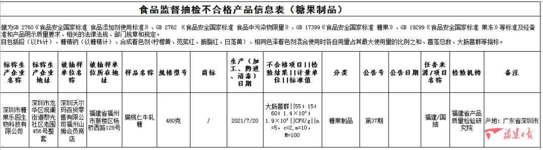 深圳市糖果樂園生物科技有限公司2021年7月20日生產(chǎn)的扁桃仁牛軋?zhí)?,大腸菌群不合格,銷售單位為深圳沃爾瑪百貨零售有限公司福州山姆會員商店,檢驗機(jī)構(gòu)為福建省產(chǎn)品質(zhì)量檢驗研究院;