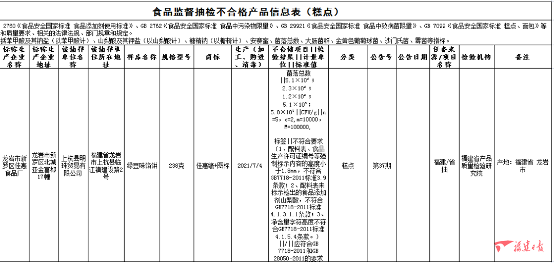 龍巖市新羅區(qū)佳惠食品廠2021年7月4日生產(chǎn)的綠豆味餡餅,菌落總數(shù)不合格、標(biāo)簽不合格,銷售單位為上杭縣明珠貿(mào)易有限公司,檢驗機(jī)構(gòu)為福建省產(chǎn)品質(zhì)量檢驗研究院;
