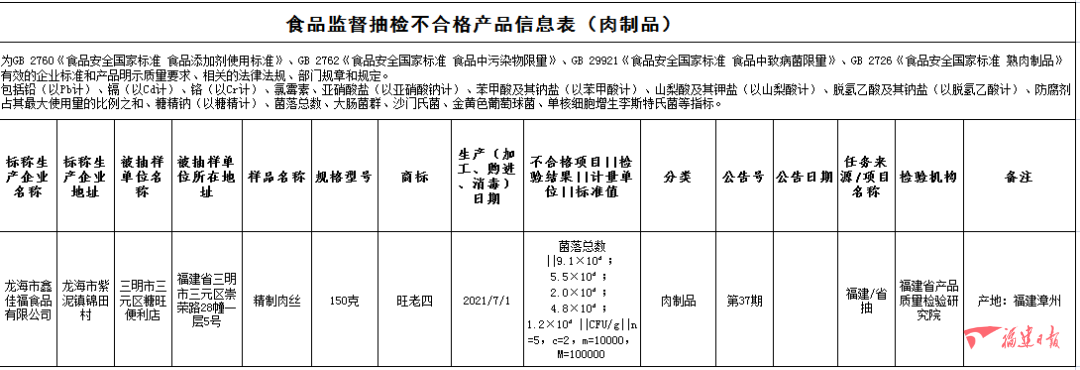 龍海市鑫佳福食品有限公司2021年7月1日生產(chǎn)的精制肉絲,菌落總數(shù)不合格,銷售單位為三明市三元區(qū)糖旺便利店,檢驗機(jī)構(gòu)為福建省產(chǎn)品質(zhì)量檢驗研究院。