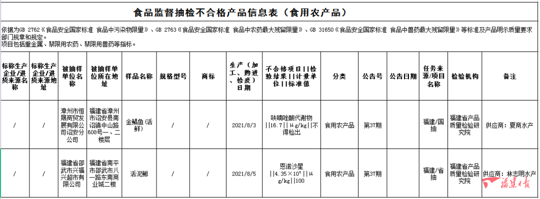 福建省邵武市興福興超市有限公司銷售的活泥鰍(購進(jìn)日期為2021年8月5日),恩諾沙星不合格,檢驗機(jī)構(gòu)為福建省產(chǎn)品質(zhì)量檢驗研究院。
