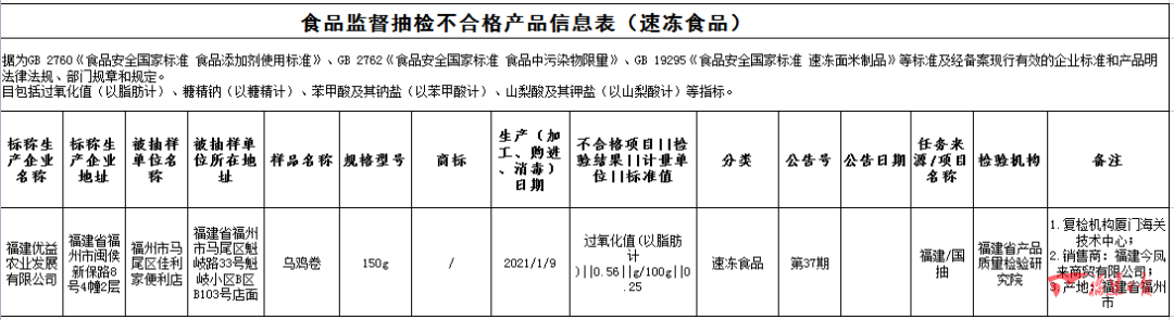 福建優(yōu)益農(nóng)業(yè)發(fā)展有限公司2021年1月9日生產(chǎn)的烏雞卷,過氧化值(以脂肪計)不合格,銷售單位為福州市馬尾區(qū)佳利家便利店,初檢機(jī)構(gòu)為福建省產(chǎn)品質(zhì)量檢驗研究院,復(fù)檢機(jī)構(gòu)廈門海關(guān)技術(shù)中心;