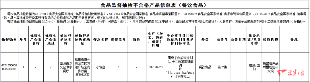 漳州市龍文區(qū)漳李餐廳的小食盤(消毒日期為2021年6月23日),陰離子合成洗滌劑(以十二烷基苯磺酸鈉計)不合格,檢驗機(jī)構(gòu)為福建省產(chǎn)品質(zhì)量檢驗研究院。