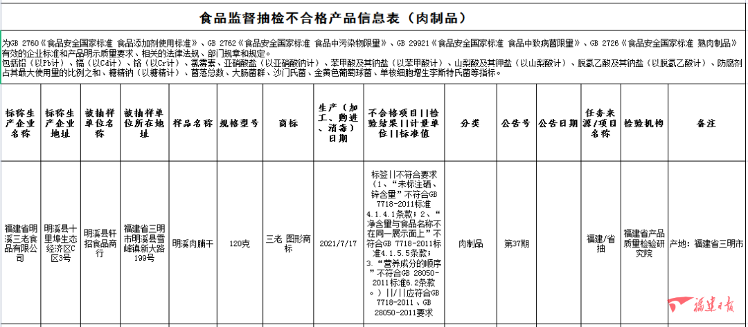 福建省明溪三老食品有限公司2021年7月17日生產(chǎn)的明溪肉脯干,標(biāo)簽不合格,銷售單位為明溪縣軒招食品商行,檢驗機(jī)構(gòu)為福建省產(chǎn)品質(zhì)量檢驗研究院;