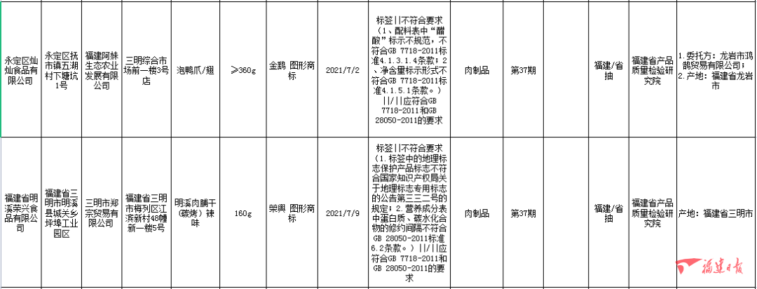 永定區(qū)燦燦食品有限公司2021年7月2日生產(chǎn)的泡鴨爪/翅,標(biāo)簽不合格,銷售單位為福建阿妹生態(tài)農(nóng)業(yè)發(fā)展有限公司,檢驗機(jī)構(gòu)為福建省產(chǎn)品質(zhì)量檢驗研究院;