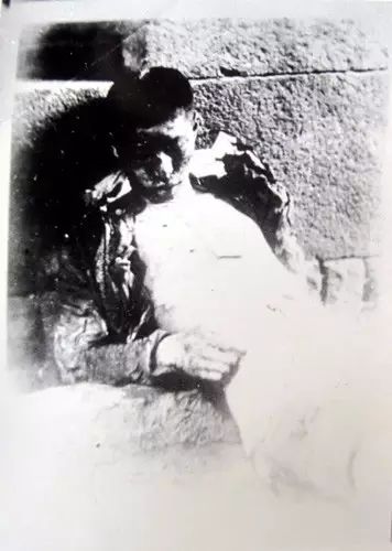方聲洞遺像,照片上他半倚在墻根,上衣敞開,身上的彈洞隱約可見。