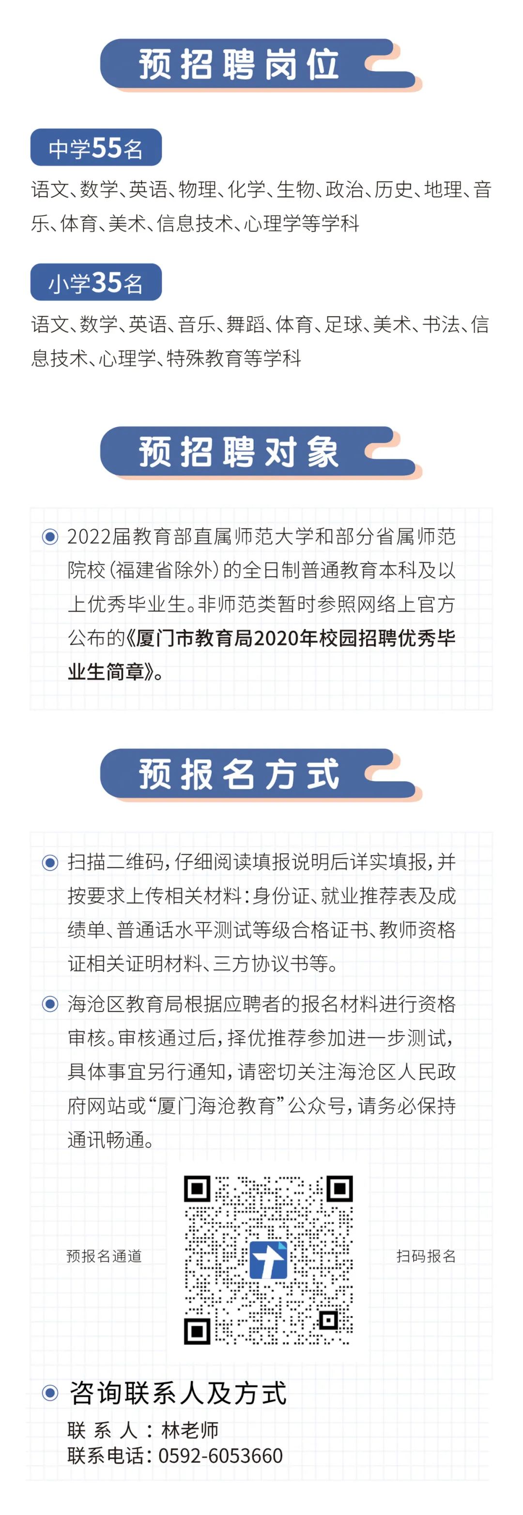 臺海網(wǎng)10月23日訊 據(jù)廈門晚報報道 昨天,廈門一中、廈門二中、廈門外國語學(xué)校等市直屬校相繼發(fā)布2022年預(yù)招聘教師需求信息。引人關(guān)注的是,此次招聘的都是編內(nèi)教師?!   ∵@幾所學(xué)校表示,此次預(yù)招聘對象為2022屆教育部直屬師范大學(xué)和省屬師范院校(福建省除外)全日制普通教育本科及以上優(yōu)秀畢業(yè)生。非師范類請參照網(wǎng)上官方公布的《廈門市教育局2020年校園招聘優(yōu)...