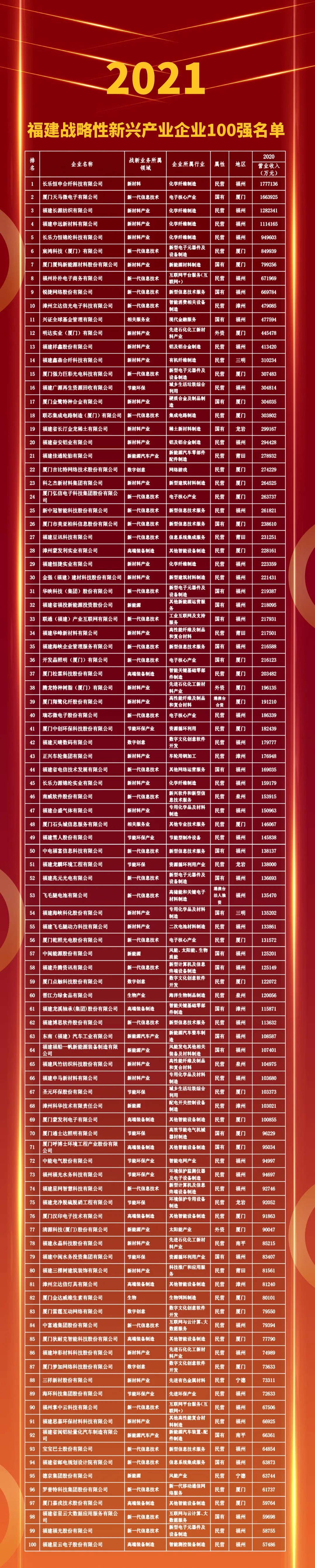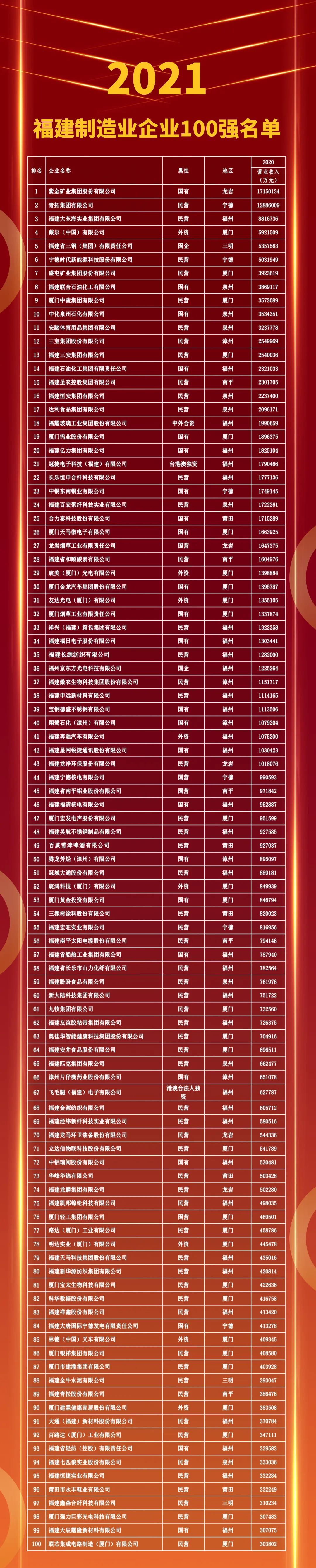 依照中國企業(yè)聯(lián)合會研究發(fā)布“中國企業(yè) 500 強”的做法要求,按照國際通行慣例,采取企業(yè)自愿申報方式,評選對象包括國企、民企、外企等各種所有制企業(yè),以2020 企業(yè)營業(yè)收入為基本標準,參考企業(yè)其它經(jīng)營指標,按省統(tǒng)計局、省國資委提供的數(shù)據(jù)、企業(yè)提供財務審計報表、上市公司公開報表、往年的百強名單等,經(jīng)匯總、整理,經(jīng)過評審會最終確定 2021 福建企業(yè)100 強排序名單。