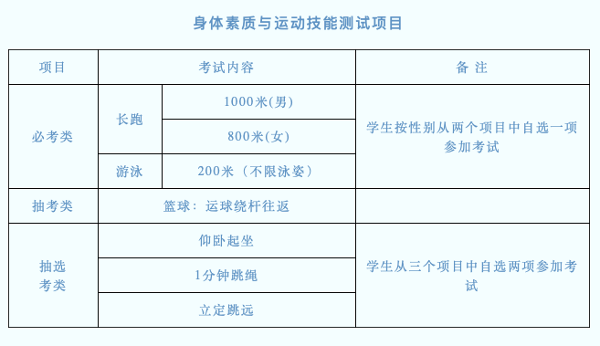 抽考自選類:立定跳遠(yuǎn),1分鐘跳繩,引體向上(男)/斜身引體(女)。