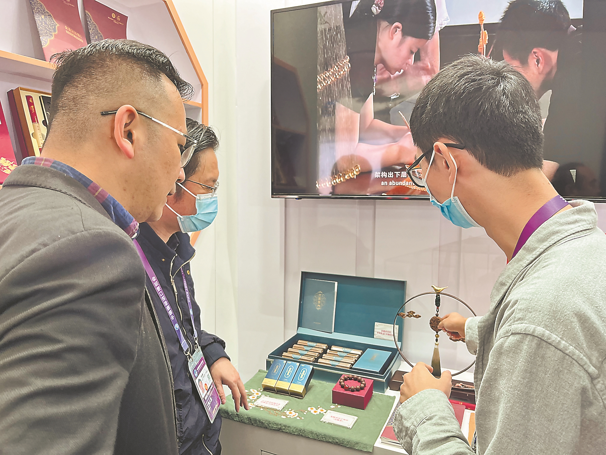 泉州養(yǎng)生香制作技藝項(xiàng)目的省級(jí)非遺傳承人張凱銘向來賓介紹產(chǎn)品。