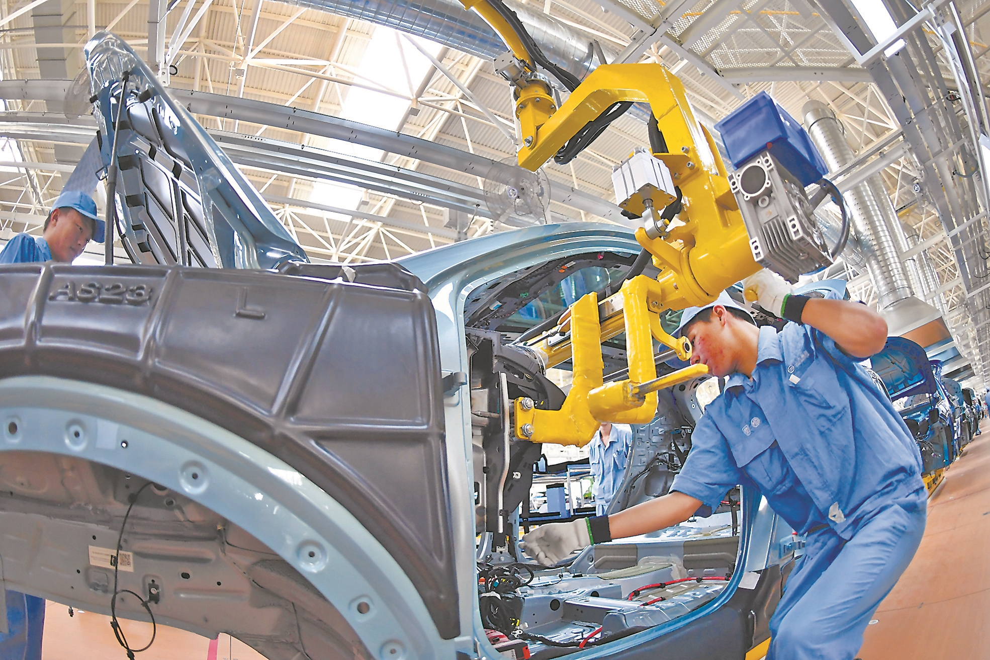 在上汽寧德基地總裝車間,工作人員正在生產(chǎn)線上有條不紊地進(jìn)行車身零部件組裝工作(資料照片)。記者 林輝 攝