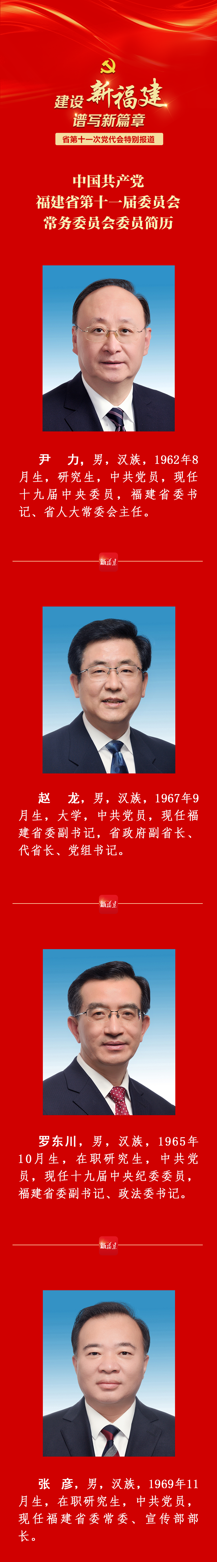 尹力 趙龍 羅東川 張彥 李仰哲 邢善萍(女) 林寶金 崔永輝 郭寧寧(女) 吳偕林 宋鴻喜 王永禮 劉建洋當(dāng)選省委常委 臺(tái)海網(wǎng)11月30日訊 (福建日?qǐng)?bào)記者 周琳)11月29日上午,中國共產(chǎn)黨福建省第十一次代表大會(huì)圓滿完成各項(xiàng)議程,在福州勝利閉幕。 閉幕式由尹力主持。 大會(huì)主席團(tuán)常務(wù)委員會(huì)成員尹力、趙龍、崔玉英、羅東川、張彥、周聯(lián)清、李仰哲、邢善萍...