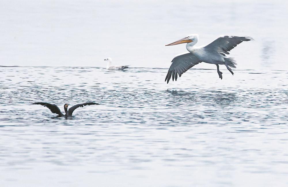 國(guó)家一級(jí)保護(hù)鳥類卷羽鵜鶘是在福州能見到的體形最大的鵜鶘,其在東亞的種群總量已不足150只。圖為在福州羅源灣拍到的卷羽鵜鶘。
