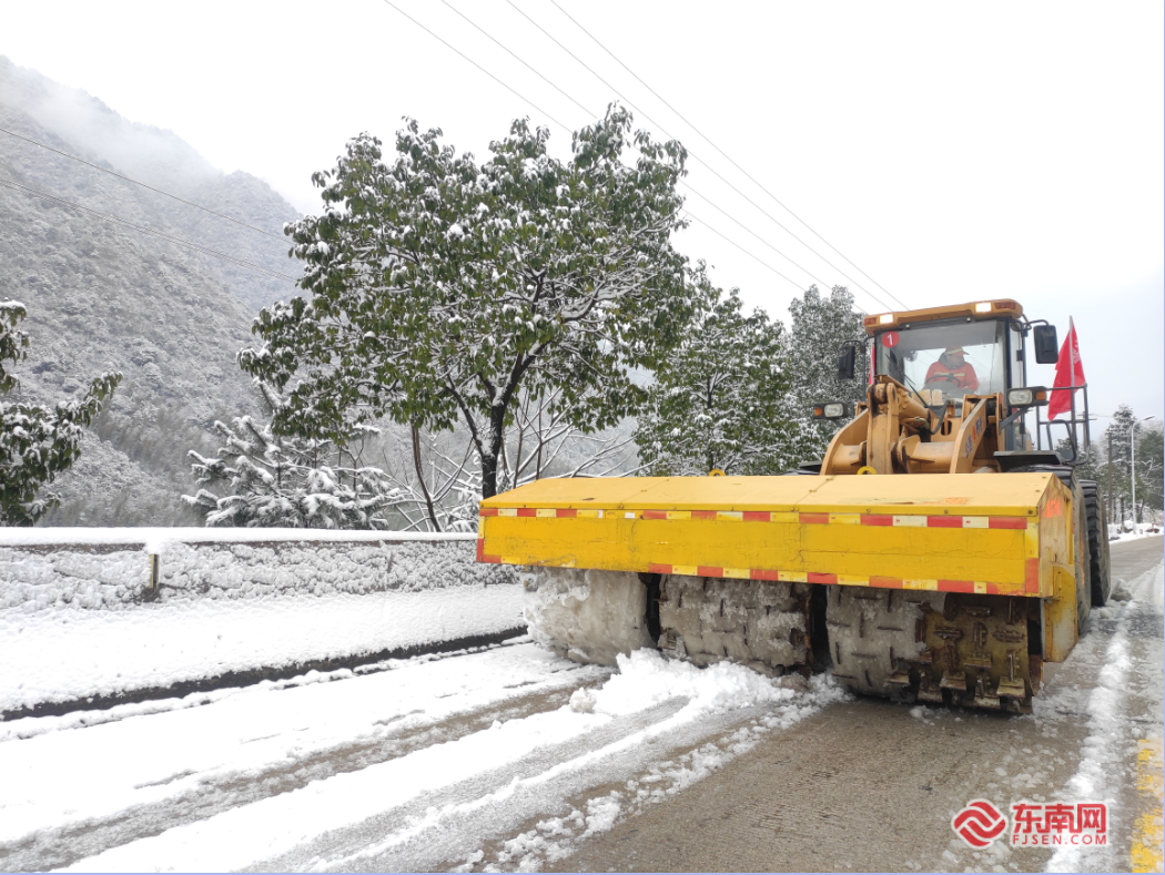 國道237線武夷山市洋莊鄉(xiāng)分水關(guān)-洋莊鄉(xiāng)大安村路段(武夷山往返江西省方向)進(jìn)行鏟冰除雪作業(yè)(占靜 攝)