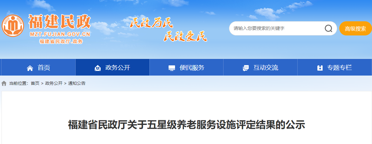 近日,福建省民政廳網(wǎng)站發(fā)布關(guān)于五星級(jí)養(yǎng)老服務(wù)設(shè)施評(píng)定結(jié)果的公示,詳情如下——