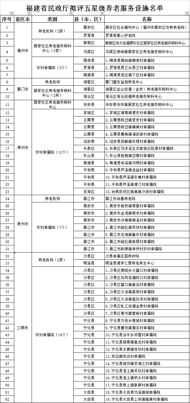 為發(fā)揮星級(jí)養(yǎng)老服務(wù)設(shè)施示范引領(lǐng)作用,促進(jìn)養(yǎng)老服務(wù)高質(zhì)量發(fā)展,根據(jù)我省養(yǎng)老服務(wù)設(shè)施等級(jí)評(píng)定辦法和有關(guān)要求,按照機(jī)構(gòu)申報(bào)、市(縣)審查推薦等程序,省民政廳委托第三方評(píng)估機(jī)構(gòu),通過(guò)資料查驗(yàn)、實(shí)地考評(píng),擬評(píng)定晉安區(qū)社會(huì)福利中心等13家養(yǎng)老機(jī)構(gòu)為福建省五星級(jí)養(yǎng)老機(jī)構(gòu)、鼓樓區(qū)華大街道屏東社區(qū)居家社區(qū)養(yǎng)老服務(wù)照料中心等14所為五星級(jí)居家社區(qū)養(yǎng)老服務(wù)照料中心、閩侯縣南嶼鎮(zhèn)柳浪村農(nóng)村幸福院等86個(gè)為五星級(jí)農(nóng)村幸福院,現(xiàn)予公示(具體名單附后)。