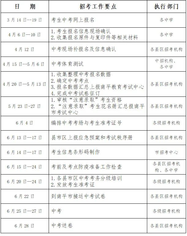 3月7日,南平市教育考試中心印發(fā)《2022年南平市中考考務(wù)主要日程安排表》,確定了中考報名時間。