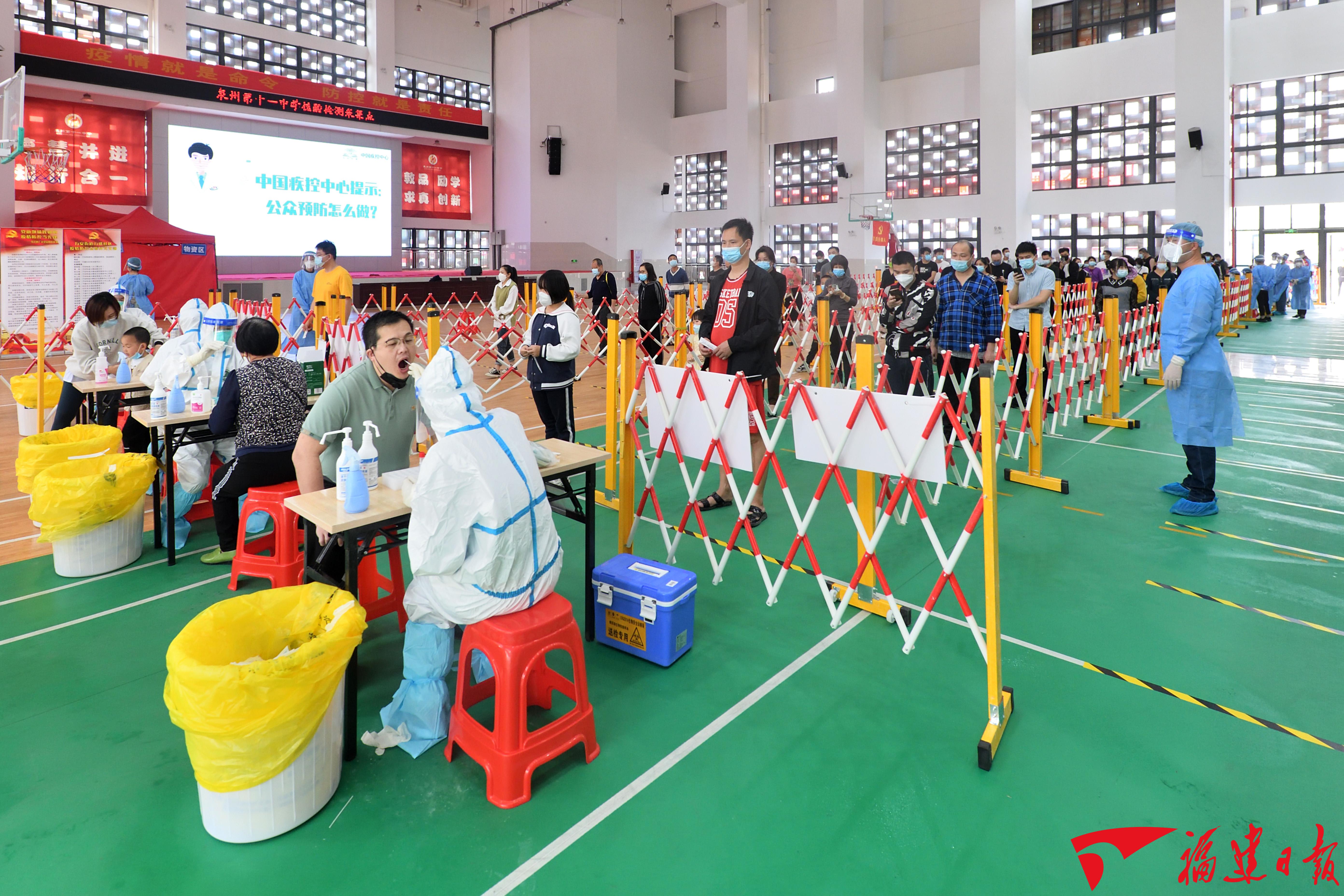 在泉州第十一中學(xué)體育館內(nèi)的核酸檢測點,社區(qū)居民佩戴口罩、自覺排隊、保持一米間距,工作人員及志愿者分工明確、有序引導(dǎo),醫(yī)護人員規(guī)范操作、熟練采樣,檢測現(xiàn)場秩序井然。尹力要求,要科學(xué)高效組織核酸檢測,進一步加強檢測人員培訓(xùn),加快核酸檢測采、送、檢進度,提高檢測能力和工作效率。