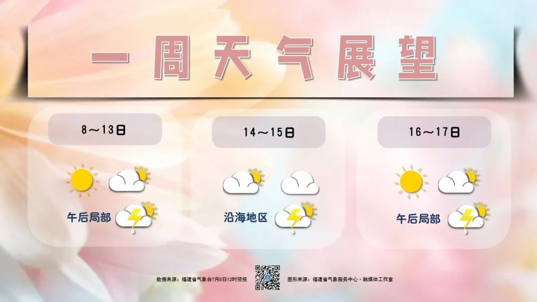 8~13日,全省晴到多云,午后局地有陣雨或雷陣雨。