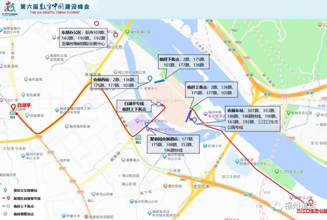 (2)可乘坐三江口生態(tài)公園——公交海峽國際會展中心東站區(qū)間專線,從三江口生態(tài)公園出發(fā)沿著南江濱東大道、浦下洲路、會展東路至公交海峽國際會展中心東站。