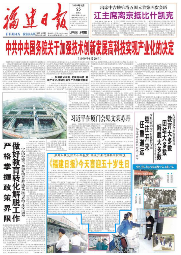 1999年是《福建日?qǐng)?bào)》創(chuàng)刊50周年。8月23日,時(shí)任代省長習(xí)近平致信祝賀,勉勵(lì)黨報(bào)工作者“在跨世紀(jì)發(fā)展的征程中,再接再厲,為建設(shè)海峽西岸繁榮帶作出更大貢獻(xiàn)”。