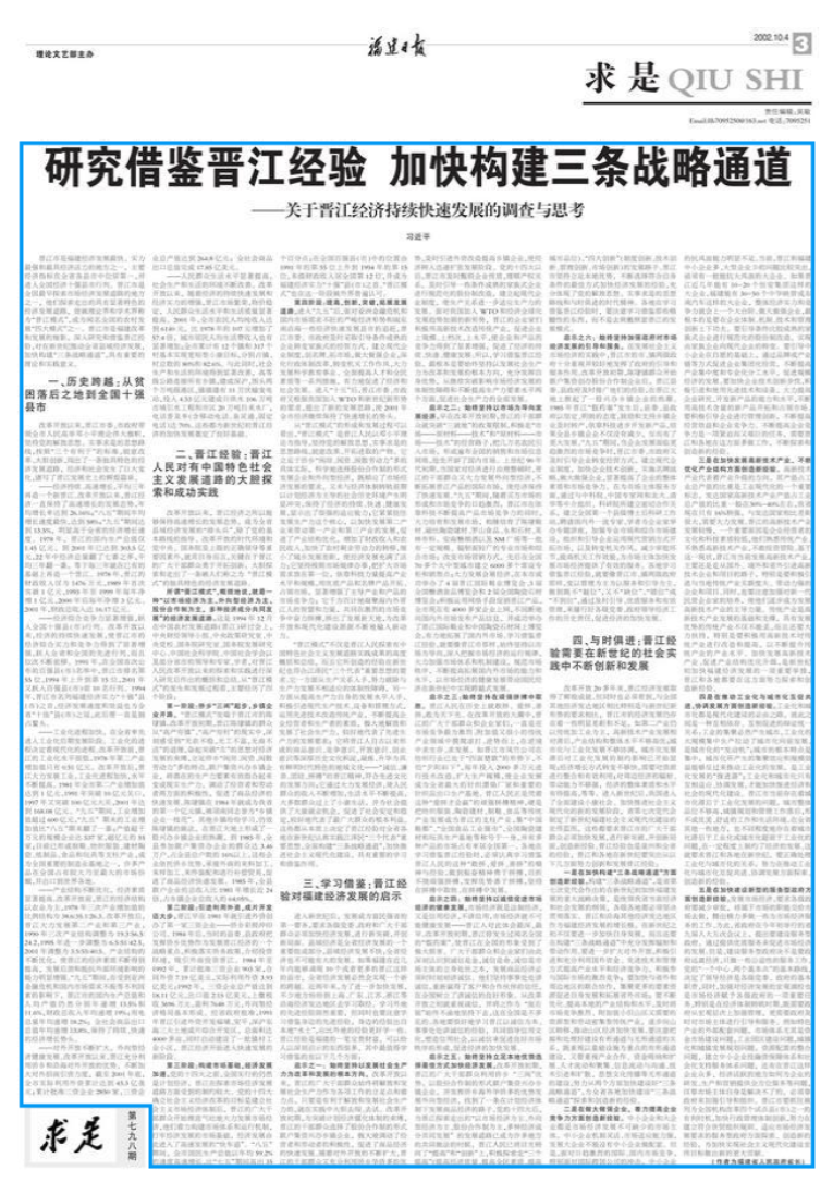 在閩工作期間,習(xí)近平在《福建日?qǐng)?bào)》上共發(fā)表32篇署名文章。梳理這些文章可以發(fā)現(xiàn),習(xí)近平在福建有關(guān)加快經(jīng)濟(jì)和社會(huì)發(fā)展的階段性思考成果,基本上都在《福建日?qǐng)?bào)》刊出。如謀劃福州發(fā)展的思考《再造一個(gè)“金三角”》和《關(guān)于擴(kuò)大開發(fā)的若干思考》、率先提出“數(shù)字福建”思考的《縮小數(shù)字鴻溝 服務(wù)經(jīng)濟(jì)建設(shè)》、總結(jié)“晉江經(jīng)驗(yàn)”的《研究借鑒晉江經(jīng)驗(yàn) 加快構(gòu)建三條戰(zhàn)略通道》等。