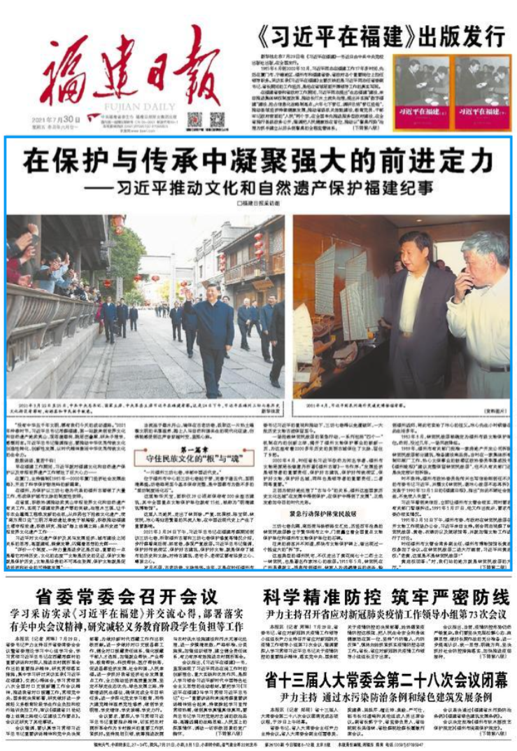 2021年7月30日,第44屆世界遺產(chǎn)大會(huì)閉幕之際,《福建日?qǐng)?bào)》刊出長篇通訊《在保護(hù)與傳承中凝聚強(qiáng)大的前進(jìn)定力——習(xí)近平推動(dòng)文化和自然遺產(chǎn)保護(hù)福建紀(jì)事》,并配發(fā)6張珍貴照片。透過文章、再現(xiàn)歷史,這些前瞻性思想理念及實(shí)踐歷久彌新,對(duì)做好當(dāng)下的文化及文化遺產(chǎn)保護(hù)工作具有重要的啟發(fā)和指導(dǎo)意義。文章發(fā)表后,《人民日?qǐng)?bào)》《光明日?qǐng)?bào)》重要版面全文轉(zhuǎn)載。