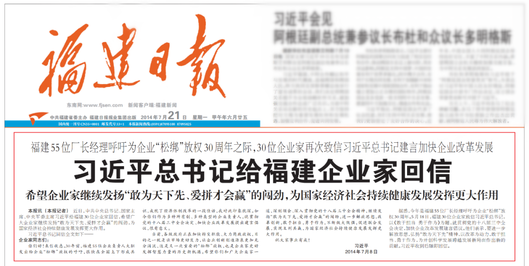 2014年7月21日,《福建日?qǐng)?bào)》頭版刊登了《習(xí)近平總書記給福建企業(yè)家回信》。信中說: