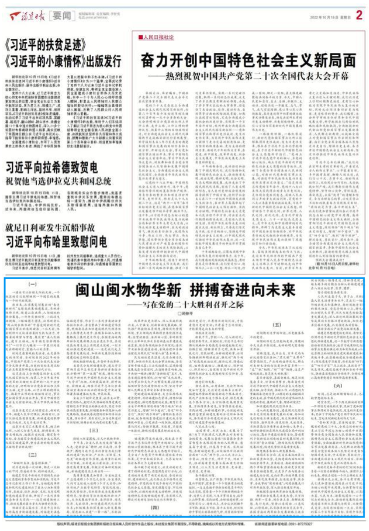2022年10月16日,黨的二十大開幕當(dāng)天,《福建日?qǐng)?bào)》刊發(fā)閔仲平文章《閩山閩水物華新 拼搏奮進(jìn)向未來——寫在黨的二十大勝利召開之際》。站在歷史交匯點(diǎn)上,閔仲平文章回望過去、展望未來,向八閩兒女發(fā)出在新的趕考之路上繼續(xù)考出好成績的召喚。