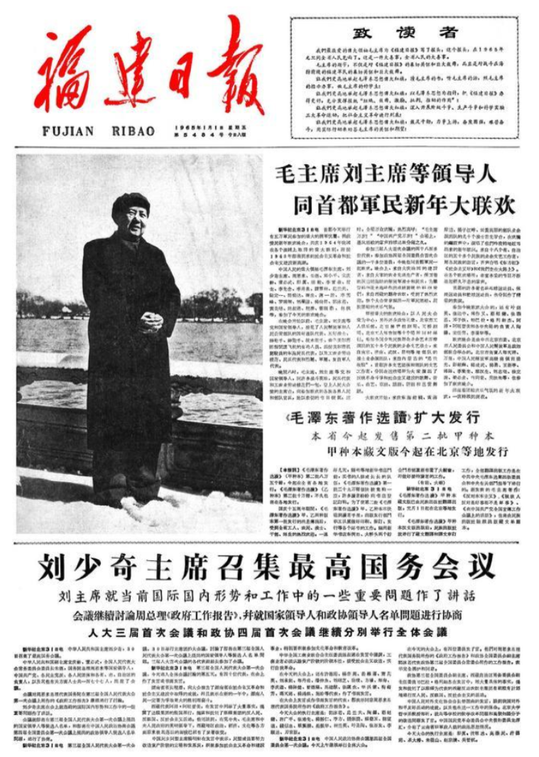 1965年元旦,八閩大地的讀者驚喜地發(fā)現(xiàn),當(dāng)天的《福建日?qǐng)?bào)》不同以往——報(bào)頭“福建日?qǐng)?bào)”四個(gè)大字鮮紅醒目,氣勢磅礴。再一看右側(cè)的《致讀者》,原來,這是毛主席親自題寫的報(bào)頭!