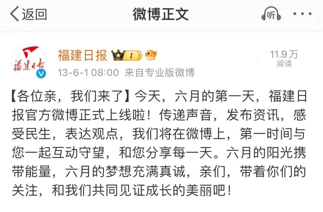 2013年“六一”兒童節(jié),一個(gè)名叫“福建日?qǐng)?bào)微博”的新生命呱呱墜地。這代表《福建日?qǐng)?bào)》從紙端出發(fā),進(jìn)軍移動(dòng)互聯(lián)網(wǎng)新征途。