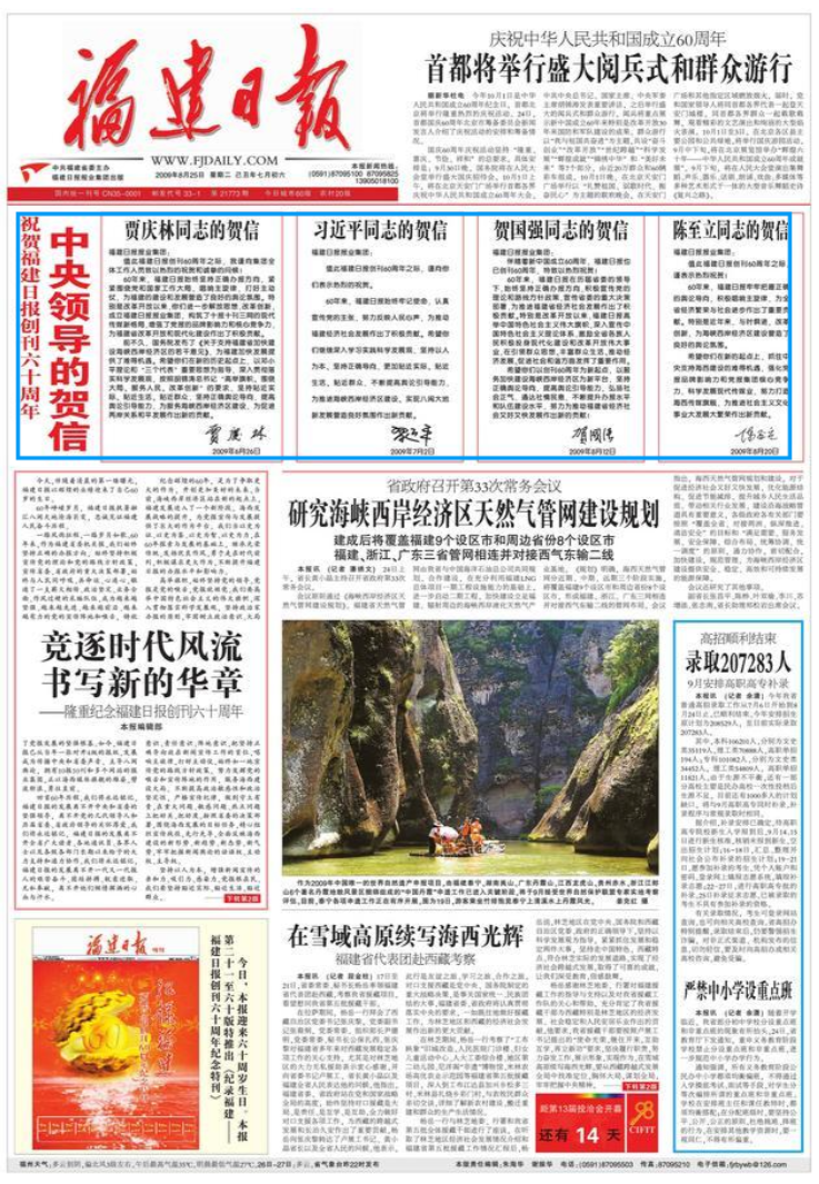 2009年是《福建日?qǐng)?bào)》創(chuàng)刊60周年。7月2日,時(shí)任中央政治局常委、中央書記處書記、國家副主席習(xí)近平致信祝賀,希望《福建日?qǐng)?bào)》“堅(jiān)持以人為本、堅(jiān)持正確導(dǎo)向。更加貼近實(shí)際、貼近生活、貼近群眾,不斷提高輿論引導(dǎo)能力”。