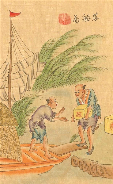 茶景全圖,裝箱上船。圖源:清代絹本彩繪