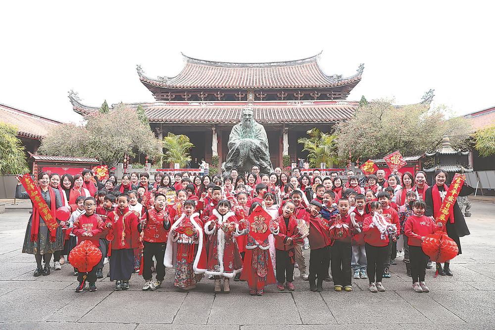 漳州文廟國(guó)學(xué)堂的孩子們用閩南語向大家拜年。 鄭文典 攝