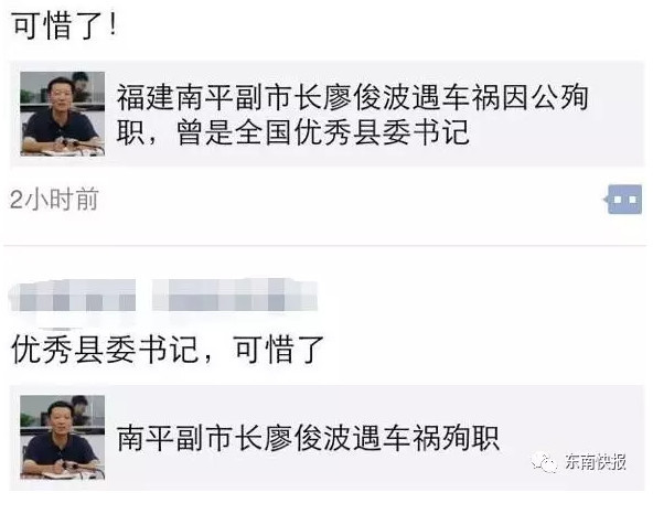 本報(bào)官微發(fā)布這條消息快訊!南平副市長、“全國優(yōu)秀縣委書記”廖俊波遇車禍因公殉職后,不少網(wǎng)友紛紛留言表示難過: