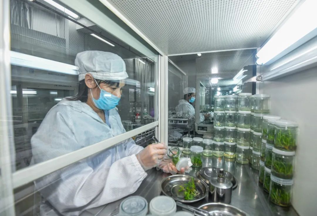 2004年,科研團(tuán)隊(duì)嘗試進(jìn)行杉木優(yōu)良無性系組培試驗(yàn),經(jīng)過幾年的探索研究,研制了杉木組培育苗技術(shù)規(guī)范并進(jìn)行產(chǎn)業(yè)化應(yīng)用。2009年,林場建成了全國最大的杉木組培苗研發(fā)生產(chǎn)基地,目前已研發(fā)具有自有知識產(chǎn)權(quán)優(yōu)良無性系組培品種14個,其中,“洋020”“洋061”兩個無性系獲得國家林木良種認(rèn)定。圖為科研人員進(jìn)行組培作業(yè)。