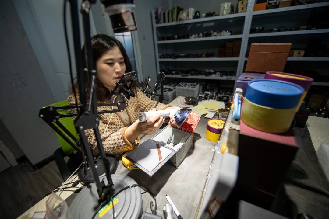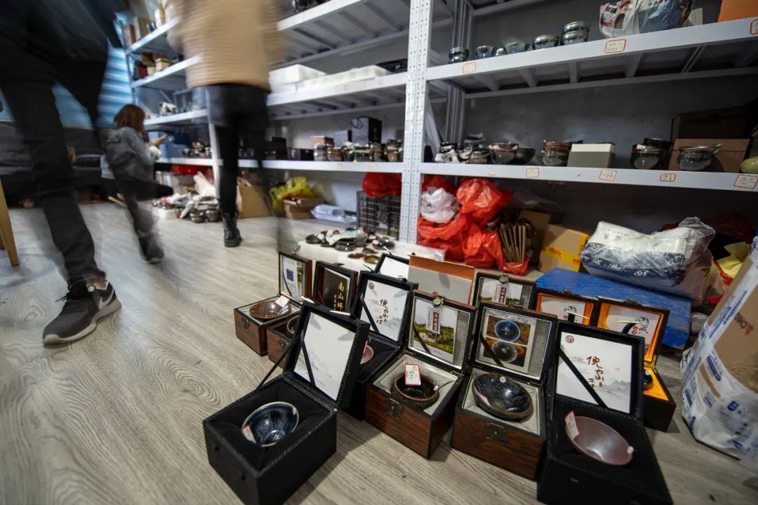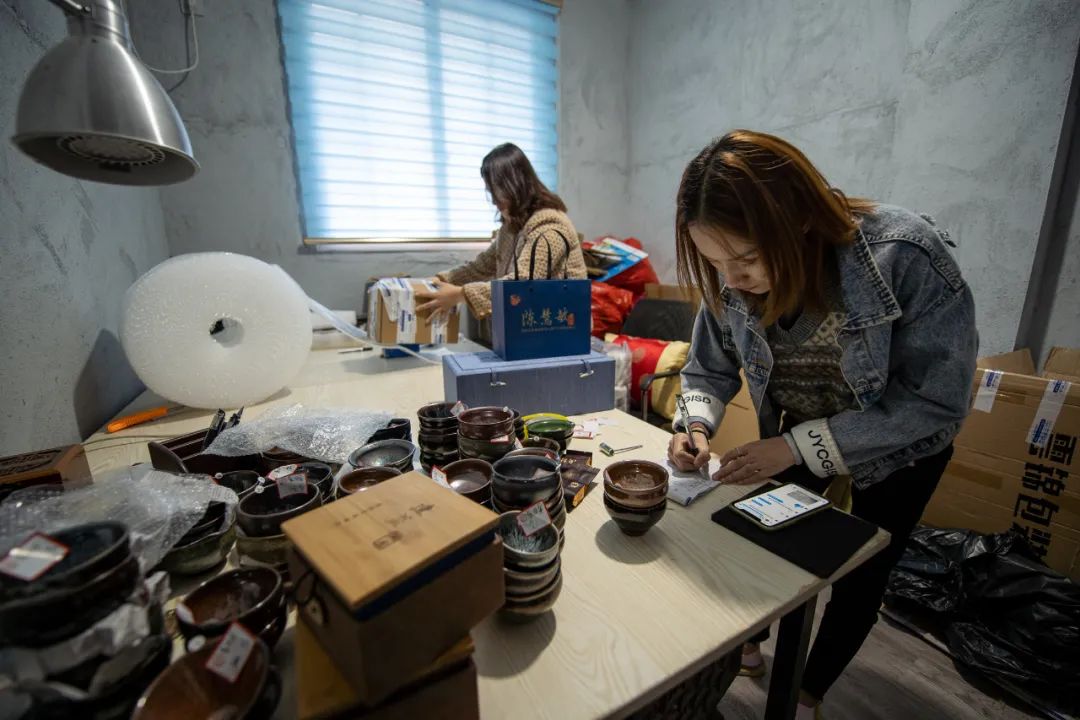直播結(jié)束,李芊和助手一同打包產(chǎn)品,在這個(gè)擺滿貨架、堆滿貨箱、稍顯局促的工作室里,塞滿了這支年輕隊(duì)伍的夢(mèng)想:“希望我們的建盞可以通過(guò)小小的直播間,走得更遠(yuǎn);希望建盞文化能夠不斷傳承和發(fā)展。”