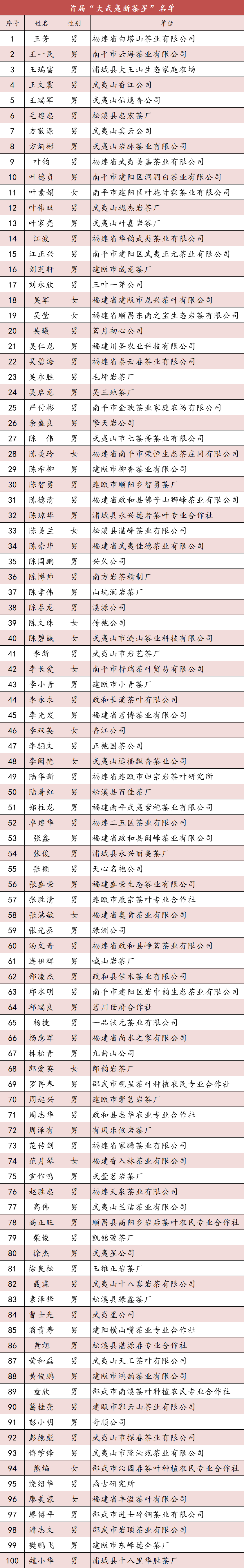 臺海網(wǎng)11月18日訊 據(jù)閩北日報微信報道 “大武夷新茶星”推薦評選活動由南平團市委、市農(nóng)業(yè)農(nóng)村局、市海峽茶業(yè)交流協(xié)會發(fā)起,旨在激勵我市中青年茶人勇于擔當,奮力拼搏,推動閩北茶產(chǎn)業(yè)持續(xù)、健康、繁榮發(fā)展。評選活動本著公平、公正、公開的原則,經(jīng)過縣(市、區(qū))相關(guān)部門推薦,主辦單位評委會審核、評選以及社會公示,最終福建省白塔山茶業(yè)有限公司王芳等100名優(yōu)秀中青年茶人獲得“大武夷新茶星”稱號。