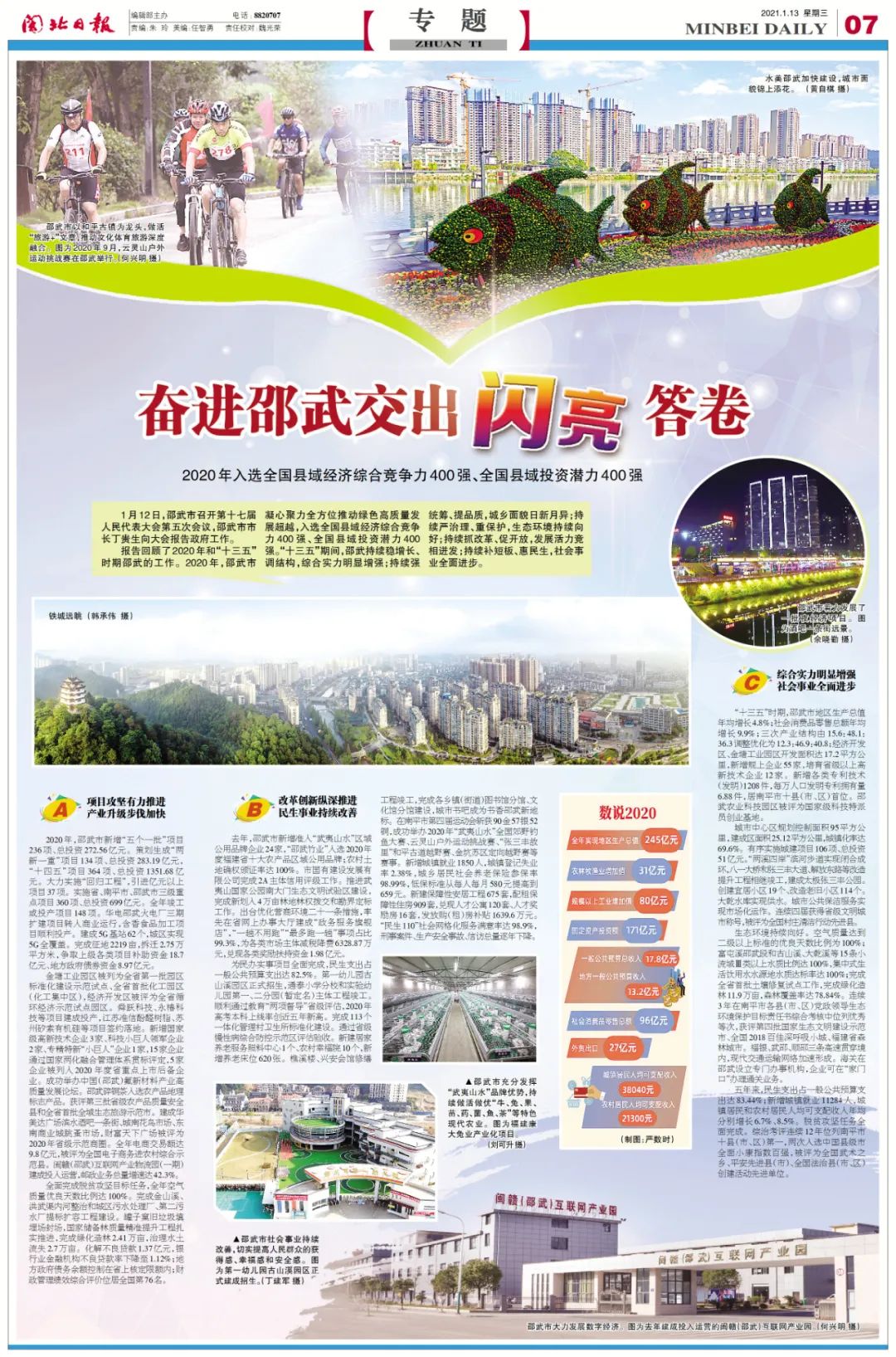 金塘工業(yè)園區(qū)被列為全省第一批園區(qū)標(biāo)準(zhǔn)化建設(shè)示范試點(diǎn)、全省首批化工園區(qū)(化工集中區(qū)),經(jīng)濟(jì)開(kāi)發(fā)區(qū)被評(píng)為全省循環(huán)經(jīng)濟(jì)示范試點(diǎn)園區(qū)。舜躍科技、永椿科技等項(xiàng)目建成投產(chǎn),江蘇準(zhǔn)信酚醛樹(shù)脂、蘇州矽索有機(jī)硅等項(xiàng)目簽約落地。新增國(guó)家級(jí)高新技術(shù)企業(yè)3家、科技小巨人領(lǐng)軍企業(yè)2家、專精特新“小巨人”企業(yè)1家,15家企業(yè)通過(guò)國(guó)家兩化融合管理體系貫標(biāo)評(píng)定,5家企業(yè)被列入2020 年度省重點(diǎn)上市后備企業(yè)。成功舉辦中國(guó)(邵武)氟新材料產(chǎn)業(yè)高質(zhì)量發(fā)展論壇。邵武碎銅茶入選農(nóng)產(chǎn)品地理標(biāo)志產(chǎn)品。獲評(píng)第三批省級(jí)農(nóng)產(chǎn)品質(zhì)量安全縣和全省首批全域生態(tài)旅游示范市。建成華美達(dá)廣場(chǎng)濱水酒吧一條街、城南花鳥(niǎo)市場(chǎng)、東南商業(yè)城跳蚤市場(chǎng),財(cái)富天下廣場(chǎng)被評(píng)為2020年省級(jí)示范商圈。全年電商交易額達(dá)9.8億元,被評(píng)為全國(guó)電子商務(wù)進(jìn)農(nóng)村綜合示范縣。閩贛(邵武)互聯(lián)網(wǎng)產(chǎn)業(yè)物流園(一期)建成投入運(yùn)營(yíng),郵政業(yè)務(wù)總量增速達(dá)42.3%。