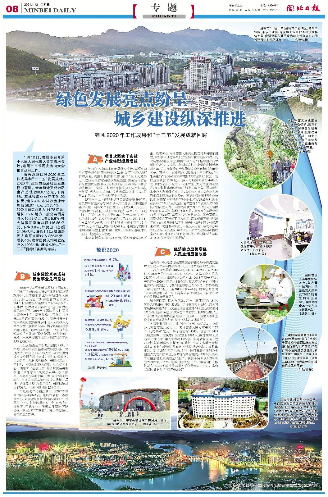 2020年,建甌市新建改建公廁8座。東門水廠完成改造提升,南環(huán)路道路及景觀提升、北環(huán)路附屬工程等項目投入使用,云際山公園二期將在春節(jié)前開放。184個村完成農(nóng)村集體資產(chǎn)股份制改革??山ù濉⒎看宕宸謩e被評為“全國鄉(xiāng)村治理示范村”和“2019年度福建省鄉(xiāng)村振興實績突出村”。新建改造示范農(nóng)房1073棟、三格式化糞池4836個,陽澤村等6個村莊被列為國家森林鄉(xiāng)村,吳大元村被評為中國少數(shù)民族特色村寨。衢寧鐵路建甌東站建成通車。城西污水處理廠一期、14個鄉(xiāng)鎮(zhèn)集鎮(zhèn)污水處理廠投入使用。獲省上閩江流域山水林田湖草生態(tài)保護(hù)修復(fù)試點正向獎勵1500萬元。