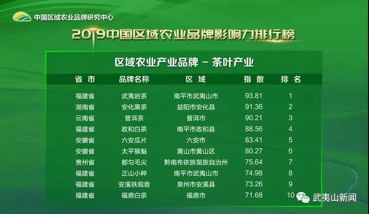 武夷巖茶獲2019中國區(qū)域農(nóng)業(yè)品牌影響力茶葉產(chǎn)業(yè)類第一位 !
