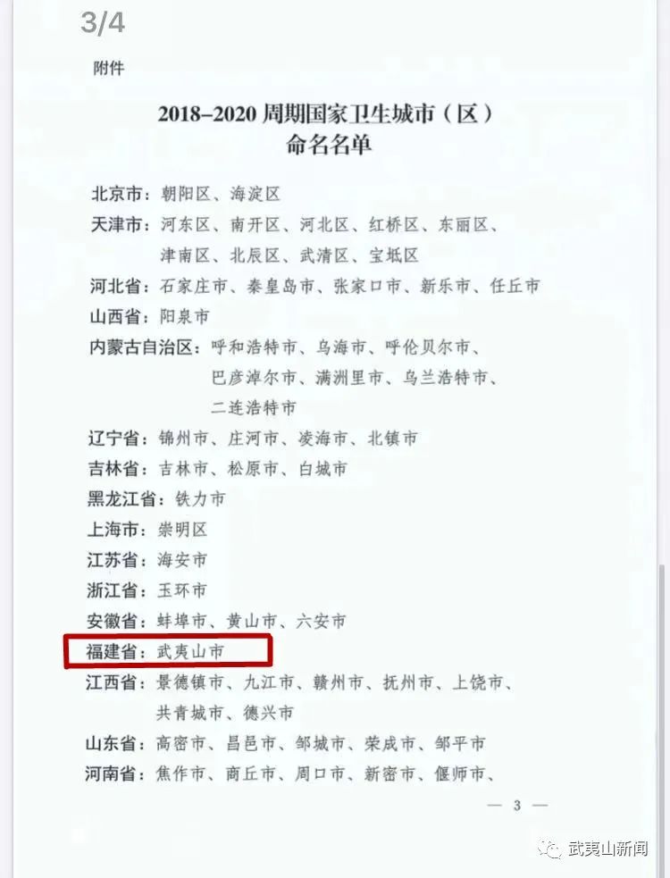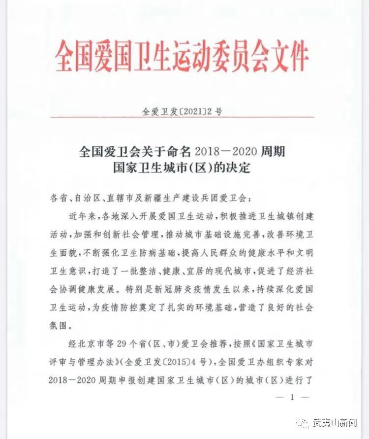 全國愛國衛(wèi)生運動委員會1月12日命名福建省武夷山市等全國120個城市(區(qū)),為2018一2020年周期國家衛(wèi)生城市(區(qū))。