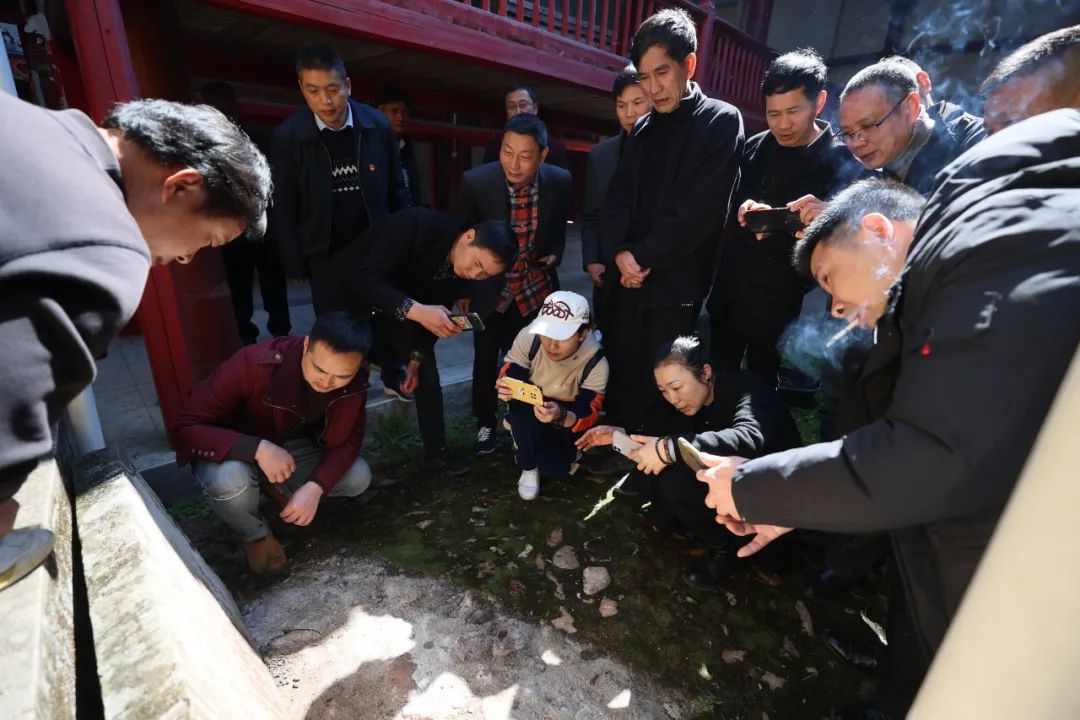建甌市建窯建盞協(xié)會的會員在小松鎮(zhèn)大廟村的一處古廟察看記載古窯址的碑記。魏永青 攝