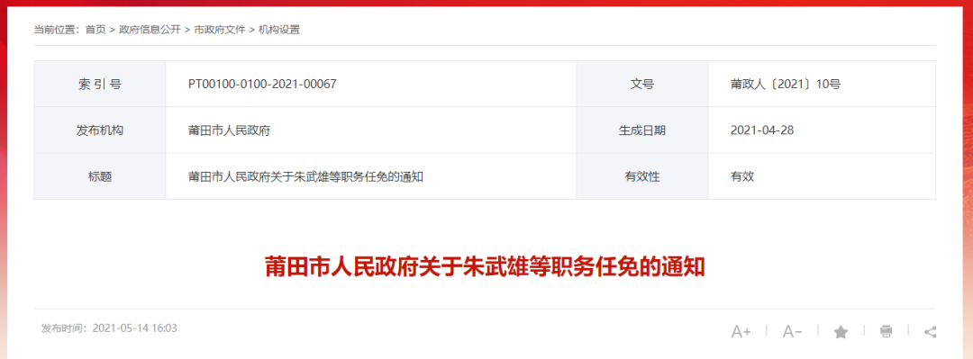 朱武雄任莆田市人民政府辦公室副主任,試用期一年;